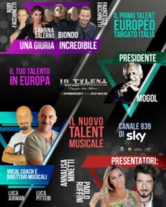 Per le Selezioni dello show itinerante che attraverserà tutta l’Europa e andrà in onda prossimamente su Sky, si cercano cantanti o aspiranti tali senza alcun limite di età (10-16 categoria junior) (17-90 categoria senior), che vogliano cogliere l’occasione di essere Protagonisti di un Talent al quale parteciperanno grandi artisti della musica (Mogol, Luca Jurman, Luca Pitteri, Biondo, Roby Facchinetti, Francesco Facchinetti e tanti altri) e che ha come obiettivo quello di portare la musica italiana in Europa.